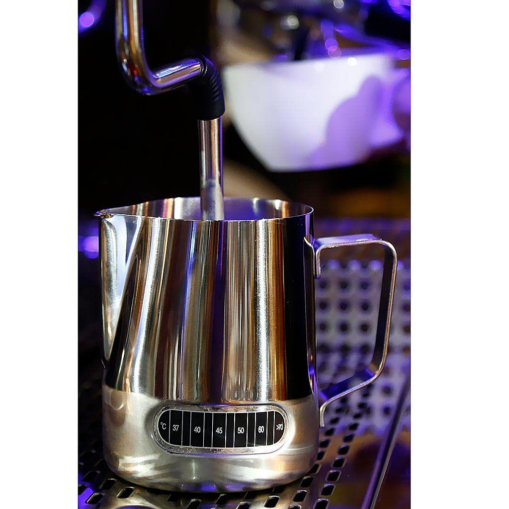 دما سنج دقیقبا دما سنج حرفهای موجود در پیچر، شما میتوانید دمای شیر را با دقت تمام اندازهگیری کنید و از داغ شدن زیاد شیر که موجب تغییر طعم آن میشود، جلوگیری کنید. این ویژگی برای کسانی که به تهیه نوشیدنیهای داغ و فومدار حساس هستند، ایدهآل است.جنس استیل ضد زنگ پیچر و شیر جوش استیل از جنس استیل ضد زنگ با کیفیت بالا ساخته شده است که در برابر حرارت مقاوم بوده و به راحتی تمیز میشود.طراحی ارگونومیک دستههای راحت و طراحی مناسب، کار با این پیچر را به تجربهای لذتبخش تبدیل میکند. ریختن شیر فومدار به راحتی و بدون هیچ مشکلی انجام میشود.ظرفیت مناسب برای استفاده خانگی و کافههاظرفیت مناسب این پیچر به شما این امکان را میدهد که به راحتی برای یک یا چند نفر شیر داغ کنید و فوم درست کنید.قابلیت فومسازی حرفهای این پیچر برای تهیه فوم شیر نرم و غلیظ، مخصوص نوشیدنیهایی مثل کاپوچینو و لاته، ایدهآل است.